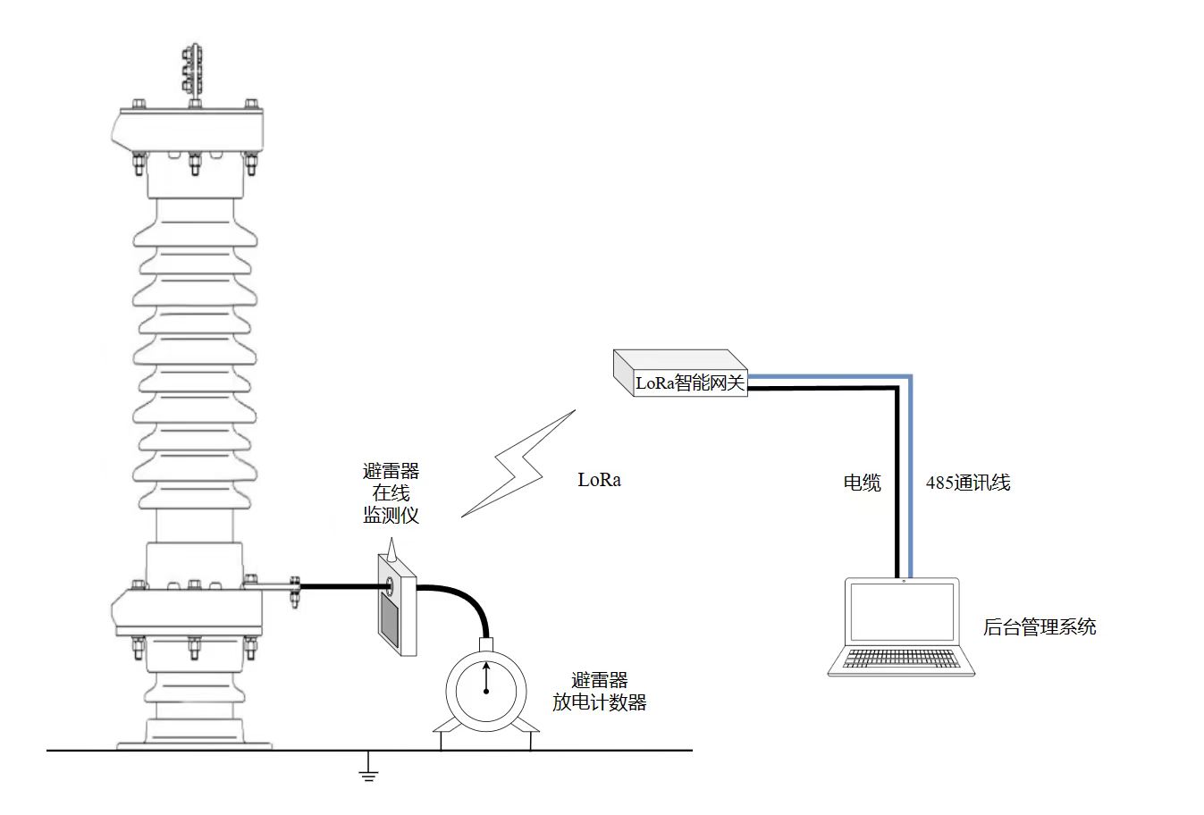 當避雷器遭受雷擊動作,或后臺服務器召測避雷器監(jiān)測儀設備時,避雷器在線監(jiān)測儀將避雷器信息(泄漏電流,動作次數(shù)及相應時間等)以LoRa通信的方式發(fā)送到避雷器監(jiān)測智能網(wǎng)關,智能網(wǎng)關再通過485通訊線將數(shù)據(jù)上傳到后臺服務器?,F(xiàn)場避雷器監(jiān)測儀利用光伏電源供電,LORA通訊距離大約2公里左右,一個220kv以上變電站大約需要兩個智能網(wǎng)關。